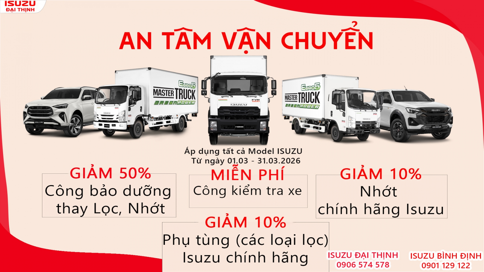💐Đại lý Isuzu Đại Thịnh triển khai chương trình khuyến mại Dịch vụ hậu mãi “An tâm vận chuyển”: Giảm giá công bảo dưỡng & phụ tùng bảo dưỡng.